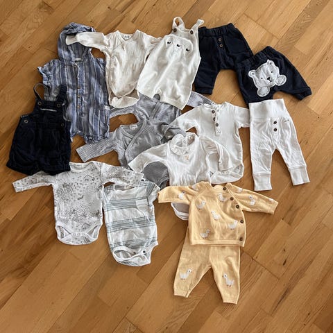 Med vemod er vi nå klare for å la disse klærne få nytt liv hos en ny verdensborger. Blanding av plagg kjøpt nytt og brukt. Noen plagg er svært lite brukt og andre ikke brukt av oss. Fremstår pent brukt og uten slitasje/anmerkninger av betydning, med mindre det er notert i bildebeskrivelsen. Klespakken består av bodyer med lang og kort arm, selebukser, pyjamaser, ytterjakke og ull. 25+ plagg og flere plagg kan tilkomme etter hvert som de blir vasket.