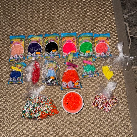 Hamaperler (anslått til ca 6000 stk) i diverse farger. Følger også pose med hhv grønn, mørk brun og hvit som er sortert. I tillegg 20 perlebrett i ulike figurer. Inkluderer også 5 stk perlebrett 15*15cm som kan kobles sammen for perling av større figurer.