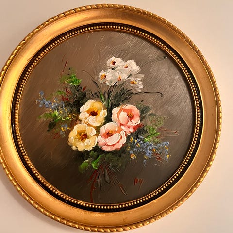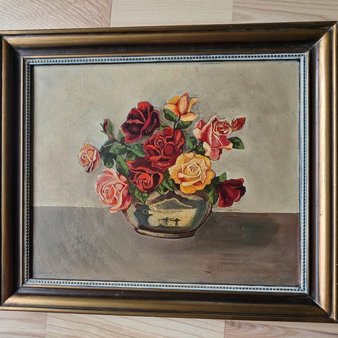 Vakkert, signert originalmaleri av rosa blomster med rik tekstur, utført i impasto-teknikk. De myke rosatonene og den håndmalte overflaten gir kunstverket et nostalgisk, vintage uttrykk. Innrammet i elegant ramme som fremhever maleriets klassiske sjarm. Et stemningsfullt kunstverk som tilfører varme og karakter til rommet.