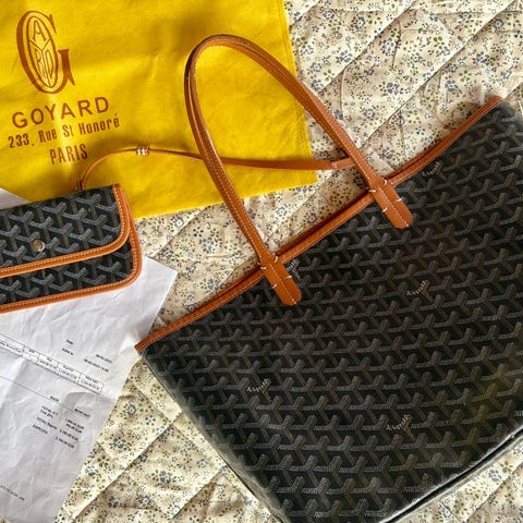Goyard dame veske laget i rosa kunstlær. Vesken har to skulderstropper og et romslig hovedrom uten innvendige lommer. Materialet er lett og gir et karakteristisk mønster på utsiden. Kjøpt i Tyrkia. Er noen flekker på insiden.