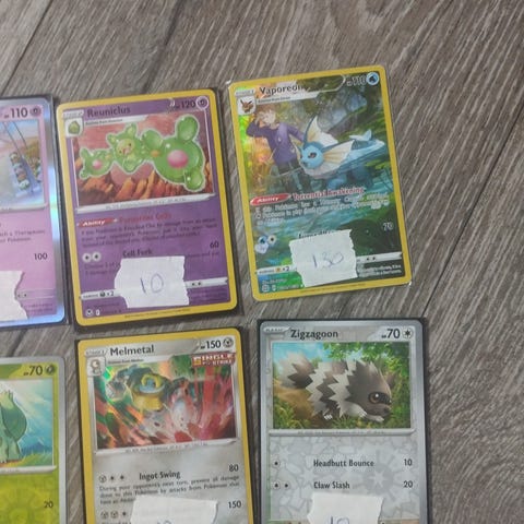 Blandet sett med Pokémon samlekort som inkluderer ulike karakterer og treningskort. Kortene varierer i type og farge, og er egnet for samlere og spill.