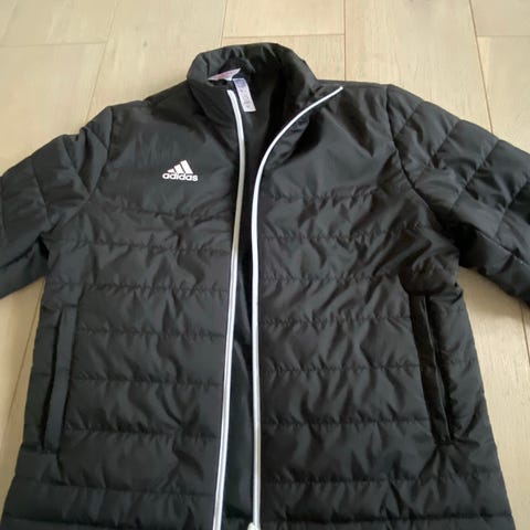 Adidas jakke for barn i størrelse 152, unisex. Jakken er svart og laget av polyester.
