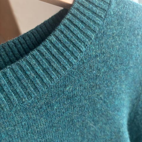 Nydelig strikkegenser i tynn myk ull fra det norske merket Woodling. Naturhvit farge i bunn, med lyseblått mønster. Normal i størrelsen.