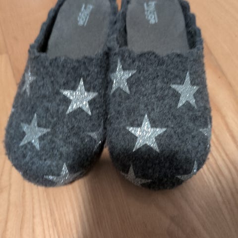 Pent brukte tøfler i ull med plastsåle.