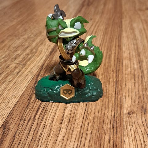 Dino-Rang Skylanders Figur i grønn med røde pigger og gullfargede detaljer. Figuren er laget av plast. Orginal kort med kortbeskytter medfølger.