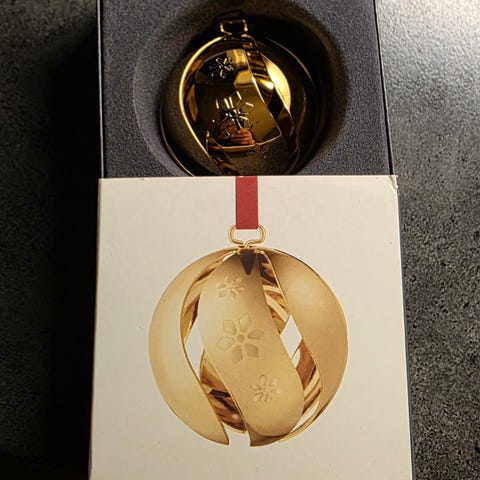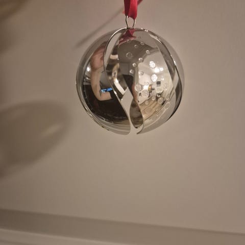 Flott Georg Jensen julekule fra 2024 i messing belagt med palladium. Rød og blå silkebånd til oppheng. Har to like. legger ut den andre i egen annonse.