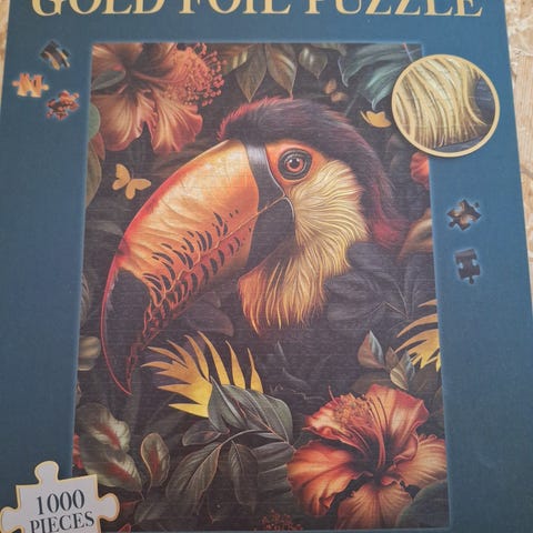 Gold Foil Puzzle med papegøye motiv, størrelse 48x68 cm. Puslespillet har gullfolie detaljer som fremhever bildet. Passer for voksne og barn som liker utfordrende puslespill med naturtema.