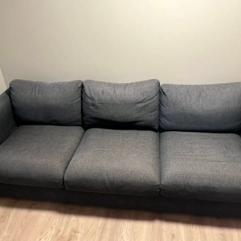 Vimle sofa fra IKEA. Satt sammen av sjeselong og enseter. Den er lite brukt, men jeg var så dum å tråkke på armlene da jeg skulle henge opp gardiner. Den ene siden er derfor ødelagt oppå, man ser det går litt ned på bildene. Derav lav pris! Armlene kan kjøpes nytt som egen del på IKEA