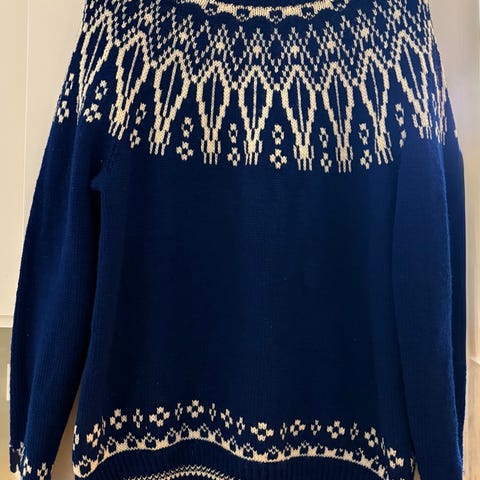 Pent strikket grå, hvit og sennepsgul Mariusgenser. Lengde ca 54 cm. Bredde målt under ermer er ca 44 cm og ermer ca 50 cm.