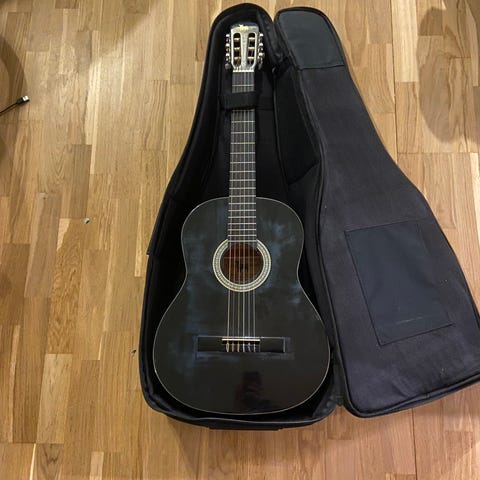 Morgan akustisk gitar i svart farge. Gitaren har en tradisjonell design med seks strenger og er egnet for akustisk spilling.