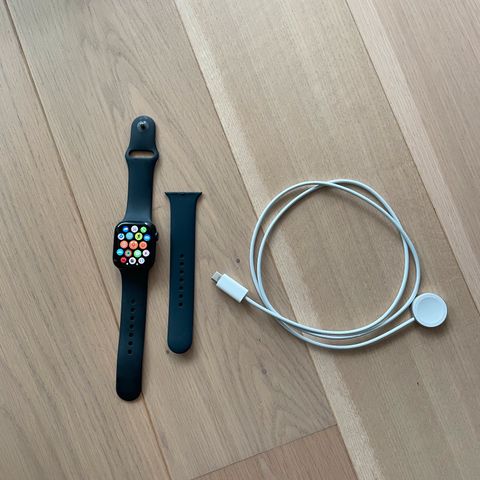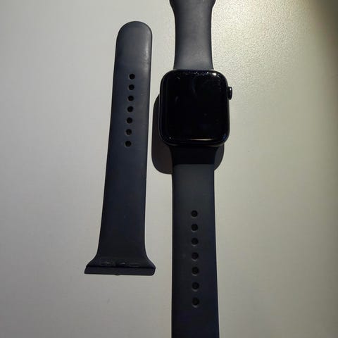 Selger en pent brukt Apple Watch Series 8 GPS + Cellular smartklokke med svart reim.