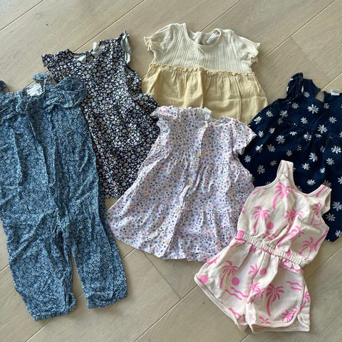 Sommerklær 86. Kjoler, t-skjorte, ankel sokker, undershorts til å ha under kjole og over bleie.