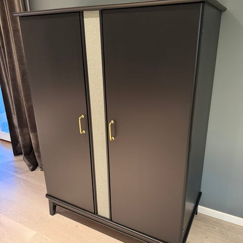 Flott skap m unike utskjæringer. Dype hyller for oppbevaring.