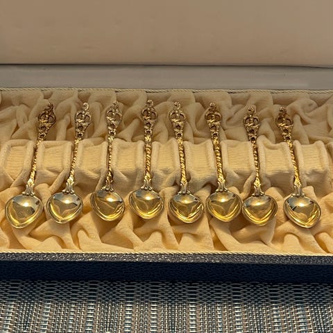 Selger disse seks nydelige mokkaskjeene i sølv (830S) i mønsteret «Dobbel rokokko». Ca. 10,2 cm lange. Selges helst samlet som et sett. Eske følger med.