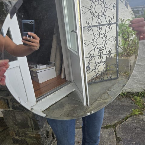 Stort speil i sølvfarge, 70 cm diameter. Kan evt sprayes sort eller annen farge for freshere finish. Oppheng på baksiden.