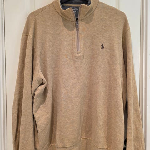 Half Zip fra Polo i str S. Genseren er i 100% bomull og har en ganske vid passform. Passer derfor heller en M/L enn hva tag-størrelsen tilsier. Er selv 186 og 83kg og passer bra til meg. Selges kun fordi jeg ikke bruker den nok.