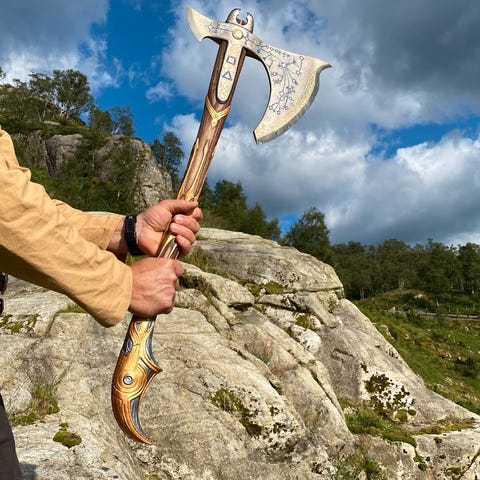 Håndlaget i rått stål forener øksen urkraft og mørk skjønnhet. De doble bladene er rikt dekorert med intrikate ornamenter inspirert av eldgamle relikvier og forbudt magi. Skaftet er trukket i mørkt lær langs hele lengden for overlegent grep og et markant visuelt uttrykk.