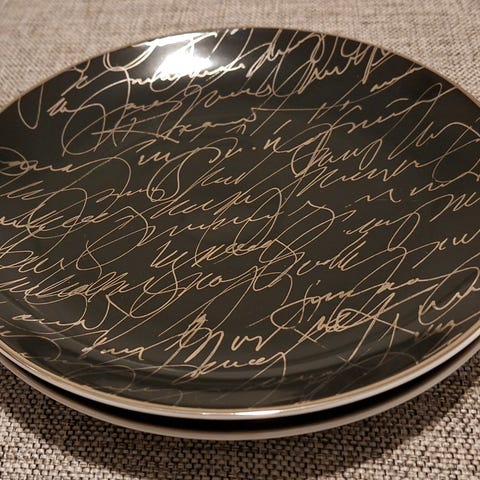 Matchende par flate tallerkner fra Porsgrunds Porselænsfabrik til 120-årsjubileet (1885–2005), med abstrakt svart/hvit avisprint-effekt og grønne streker – unik, moderne dekor som gir kunstnerisk følelse.