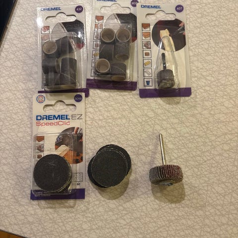 Verktøyet kommer med 128 tilbehør av ulike slag, for eksempel høyhastighetsfres, slipestift, slipeskiver og poleringsskiver. Dessutom følger disse 6 tilleggene med: