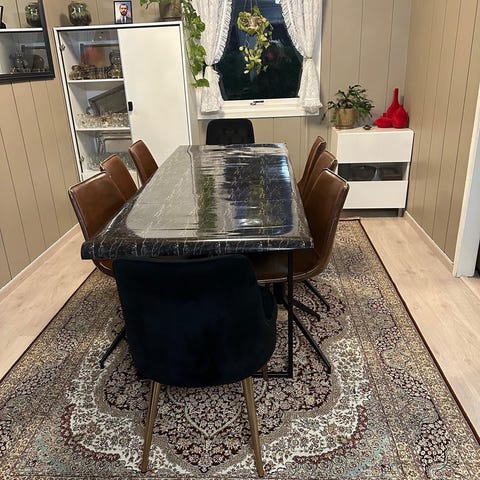 Ny spisestue inkludert 6 komfortable stoler. Høyglanslakkert bordplate og understell.