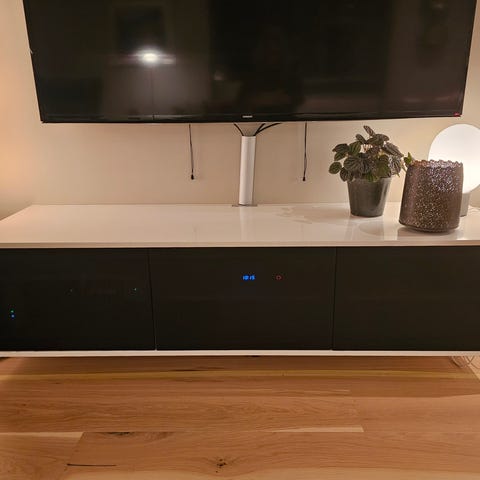 Dette er et elegant, solid og fleksibelt hi-fi-møbel med to seksjoner, slik at du både har plass til et vanlig anlegg med to komponenter i tillegg til ekstra apparater, tilbehør og andre ting i seksjonen ved siden av.