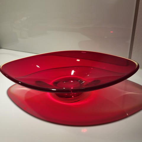 Laget av kraftig tung glassmasse, med en fremtredende grønn farge i midten som går over i en klar kant. Formen er asymmetrisk med en fordypning i midten.