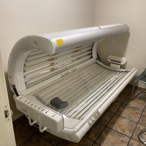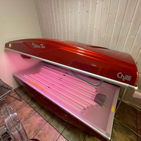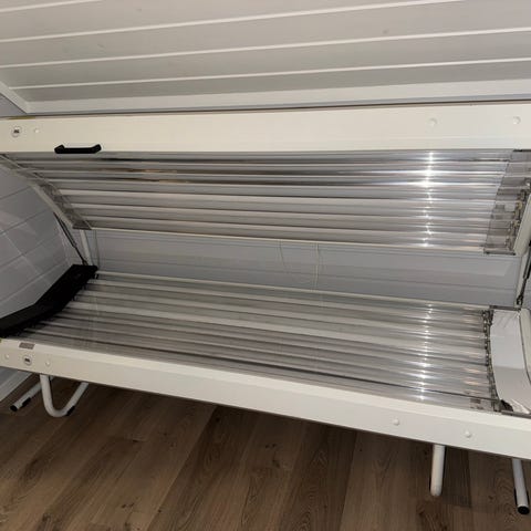 Sundream Solarium solseng med innebygde UV-lys for kunstig soling. Designet for hjemmebruk og tilbyr en komplett solingsopplevelse.