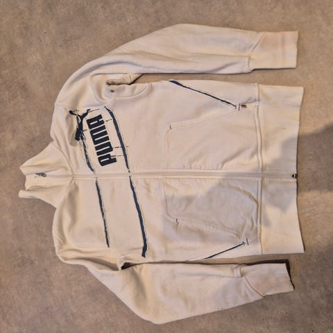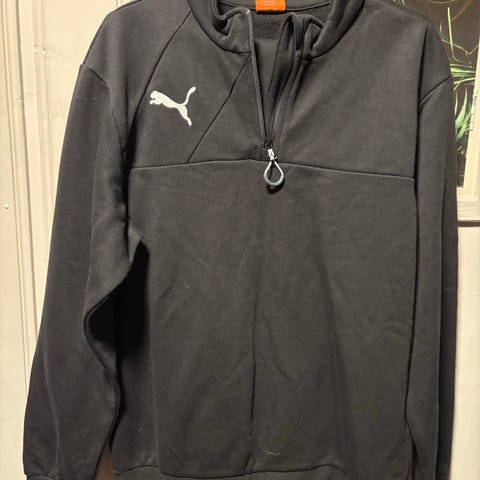 Puma hettegenser og joggebukse for herre i størrelse S. Settet er svart og laget av bomull. Hettegenseren har en stor Puma-logo på brystet, og joggebuksen har en mindre Puma-logo på benet. Passer til fritidsbruk og trening og hverdags 🙂