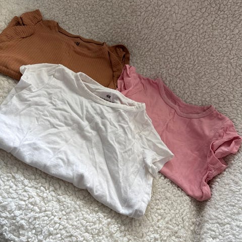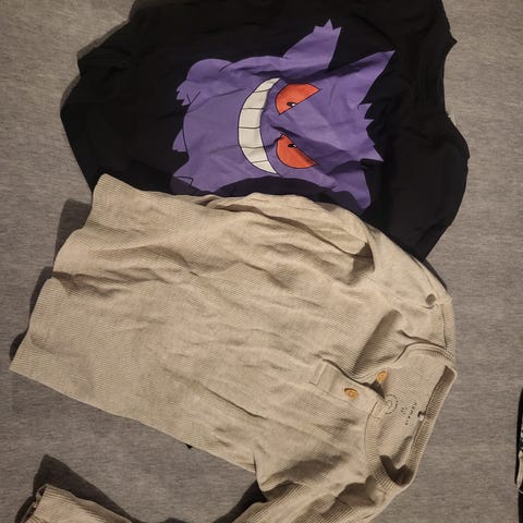 Pent brukt, da vi har hatt mange t-skjorter. Litt "avskalling" av printet på pokemon t-skjorten. Ikke veldig synlig. Ellers ingen anmerkninger. Kan ikke se noen flekker eller slitasje på noe av dem. Printet på Spiderman t-skjorten er laget på den måten. Nypris rundt 600kr