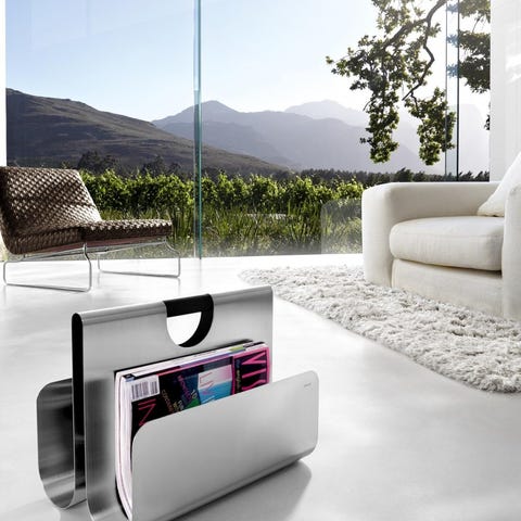 Avisholderen er i svart skinn. Rustfrie stålben. Den har stått i et røyk og dyrefritt hus.