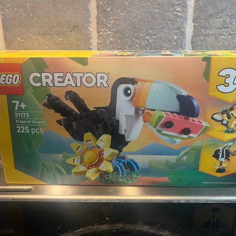 LEGO Creator Tropical Toucan byggesett med 225 deler. Passer for barn fra 7 år og oppover. Settet kan bygges til tre forskjellige modeller, inkludert en tukan, en sommerfugl og en annen tropisk fugl.