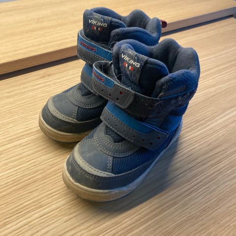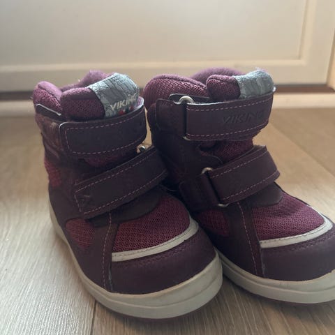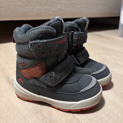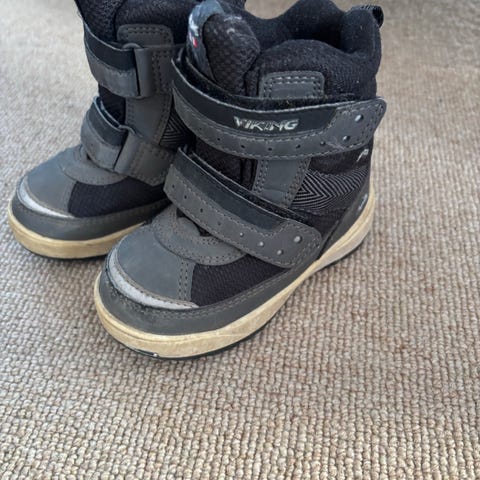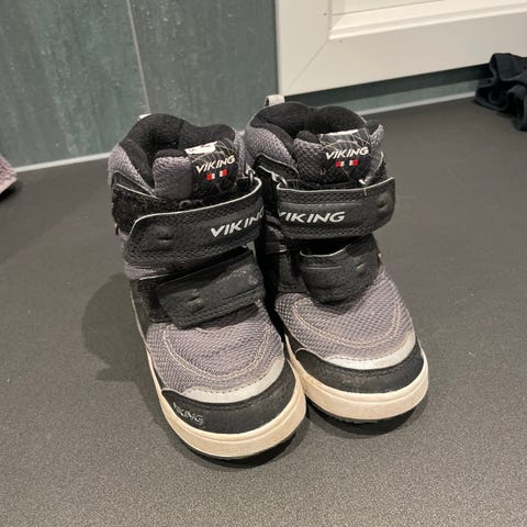 Viking barnesko for unisex i størrelse 23. Skoene er svarte og egnet for barn. De har borrelås for enkel justering og en slitesterk såle med godt grep, egnet til utendørs bruk. Kan hentes på Haslum i Bærum.