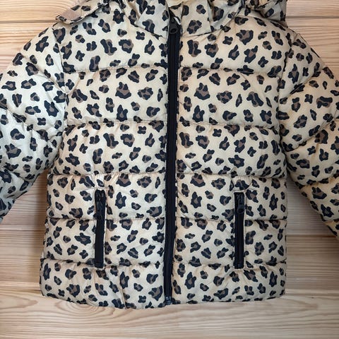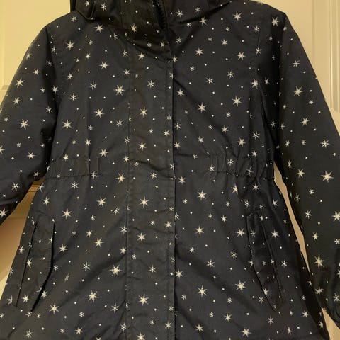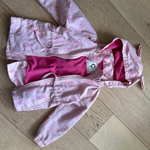 Stilig jakke i størrelse 104 med flerfarget blomstermønster. Jakken har glidelås foran og ribbestrikkede kanter ved ermer og hals. Pent brukt, med bare noen få nupper ytterst på ermene. Perfekt å bruke om vår, sommer og høst.