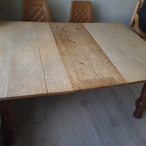 Godt brukt og solid, men normal slitasje. Trekket på stolsetene kan skiftes og stolene kan pusses/males.