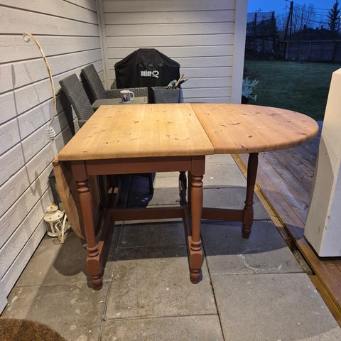 retro, vintage, kjøkkenbord, spisebord, klaffebord, klaffer, uttrekksbord, pinnestol, pinnestoler, Windsor, spisestol, spisestuestol, kjøkkenstol, dreide ben, spiler, sprosser, H-sprosser, treverk, tre, lakk, beiset, polstret, stripete, stoff, 70-tall, 80-tall, klassisk, skandinavisk, bondestol, tradisjonell, nordisk, nostalgi, antikk, restaurering, DIY, oppussing, kjøkken, spisestue, møbler, interiør, Oslo, Kjelsås, hentes, plassbesparende, praktisk, 3 stoler, 4 stoler