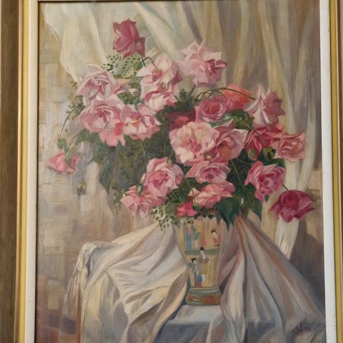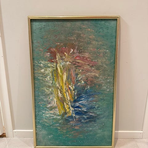 Stort, gammelt maleri på innrammet lerret. 76x63 cm. Kjøpt på bruktbutikken på Os. 200kr/bud. Må hentes, sender ikke.