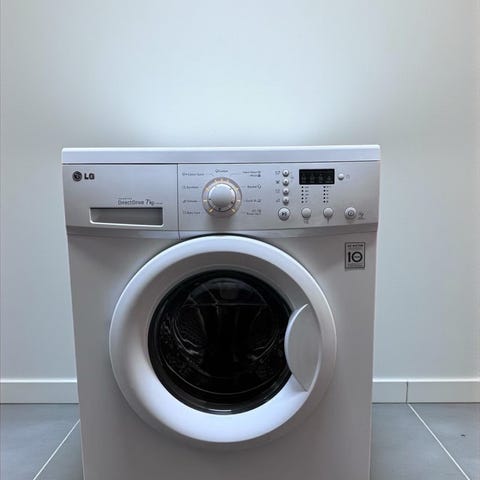 LG Frontmatet vaskemaskin. Hvitt ytre med digitalt kontrollpanel og stor rund dør for frontlasting. Egnet for husholdningsbruk.