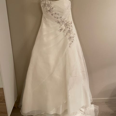 Kjolen har vært på rens etter bruk og klar for ny brud. Oppbevaringspose med glidelås for kjolen følger også med.