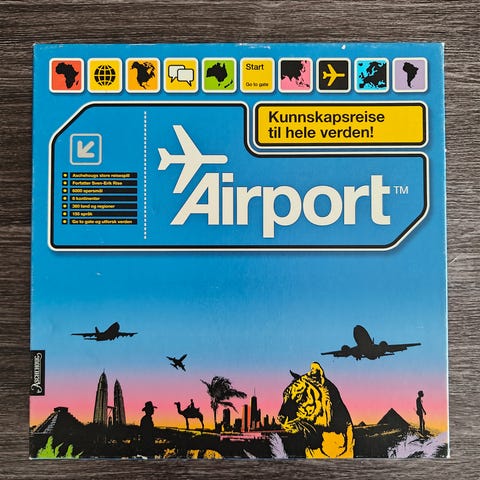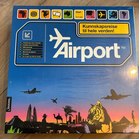 Airport er Aschehougs nye.kunnskapsspill om alle verdens land og folk..Her kan man «fly».mellom.samtlige seks verdensdeler og samle.på kontinentkort til man har verden komplett..Egne kategorifelt for språk, land, verden og flyplasser gjør spillet til en.morsom og lærerik utfordring for alle reiseglade. Sven-Erik Rise -.mannen bak Europa på boks, boken 3003 spørsmål.og medforfatter til.brettspillene Passport og JuniorPassport - har laget.over.5000.spennende spørsmål om.verdens.land, regioner og språk. Airport er et moderne brettspill, der spillerne involveres hyppig.og med mulighet for dueller..Spillet egner seg også spesielt godt til lagspill. For 2-6 spillere fra 14 år.