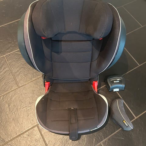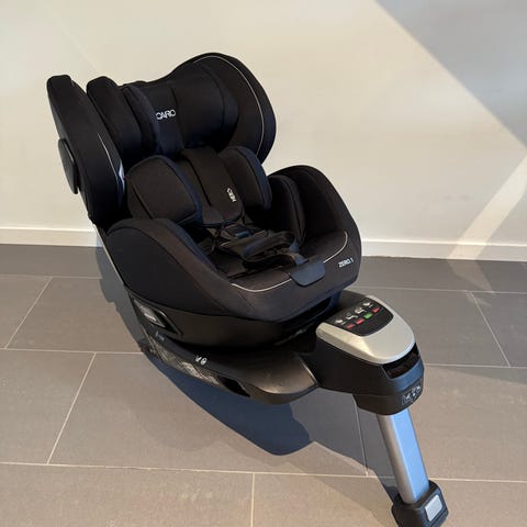 Solid barnesete selges. Dette kan brukes fra nyfødt opp til 18 kg. Bilstolen har to deler, spedbarnsdelen brukes til barnet er stort nok til å sitte i det store setet.