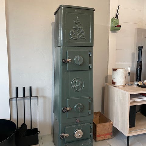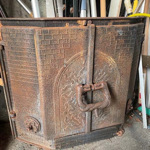Antikk støpejernskomfyr med flere nivåer og dekorative mønstre. Komfyren har et klassisk design med dører og åpninger for ildsted og røykgass. Laget av støpejern, egnet for oppvarming og matlaging i tradisjonelle omgivelser.