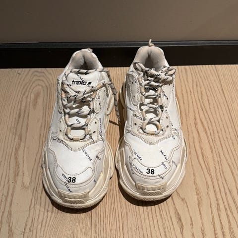 Balenciaga Sneakers joggesko i størrelse 38. Fargen er hvit med detaljer i beige. Skoene har en tykk såle og snøring foran. Materialet er en kombinasjon av tekstil og syntetisk materiale. Brukt kun til spesielle anledninger og er svært pent brukt✨