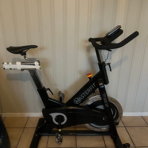 Lite brukt Masterfit TP 900 SP spinningsykkel med digitalt display, justerbart sete og styre, samt pedaler med stropper og SPD (standard click pedal). Egnet for innendørs trening og kondisjonsøkter.
