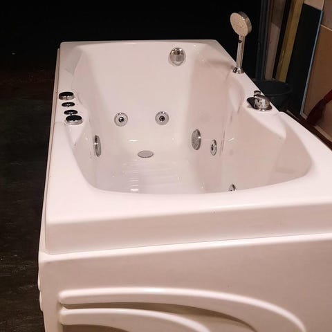 Barnebadekar i grå plastmateriale, formet som en hval. Egnet for bruk til små barn.