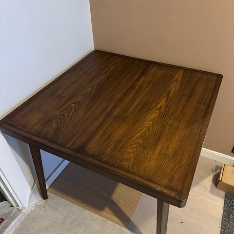 Spisebord i tre (eik) med plate i respatex. Bordet er både stødig og funksjonelt. Det er to plater til å trekke ut, slik at det kan bli plass til 10 personer rundt. Når uttrekksplatene, som er skjult under bordplaten, ikke er i bruk tar bordet liten plass: 90x70 cm.