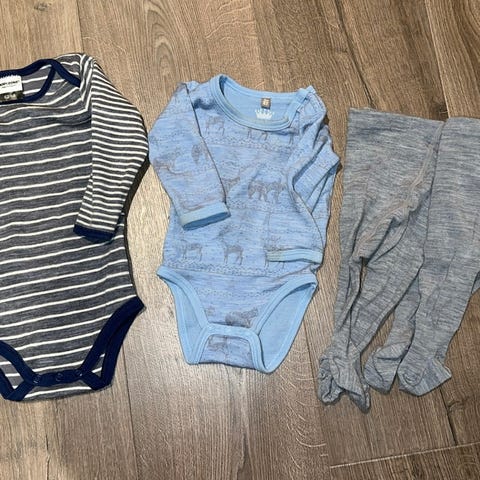 Ullpysj fra Name It, body i ull/bambus fra Joha og body med korte ermer fra Nøstebarn kan følge med om ønskelig.