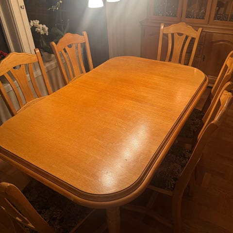 Bord, to forlengerplater, 6 stoler