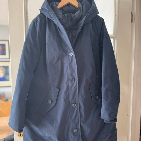 Lite og pent brukt parkas; mørk blå med sort fuskepels rundt hetta, noe innsvingt modell. Normal i størrelsen.
