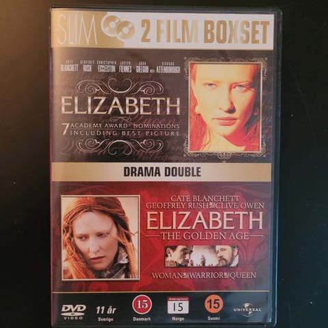 Elizabeth The Golden Age DVD film med skuespillere Cate Blanchett, Geoffrey Rush og Abbie Cornish. Inneholder historisk drama om dronning Elizabeth I av England. Format: DVD. Norsk tekst.