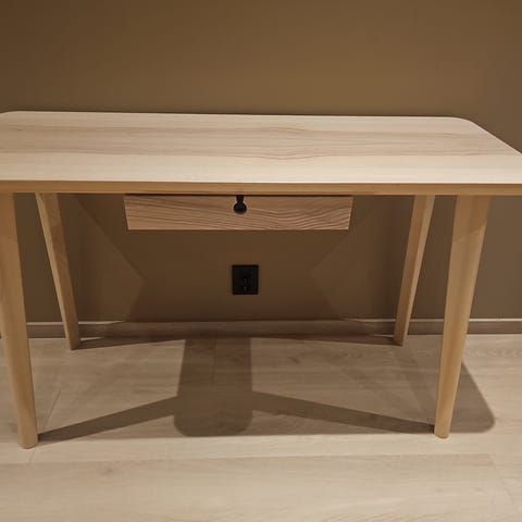 Svært lite brukt skrivebord selges pga. flytting. Er i fint stand, kun en liten misfarging under der lampen har stått (se siste bilde). To skuffer meg god dybde og et skap med justerbar horisontal skilleplate.